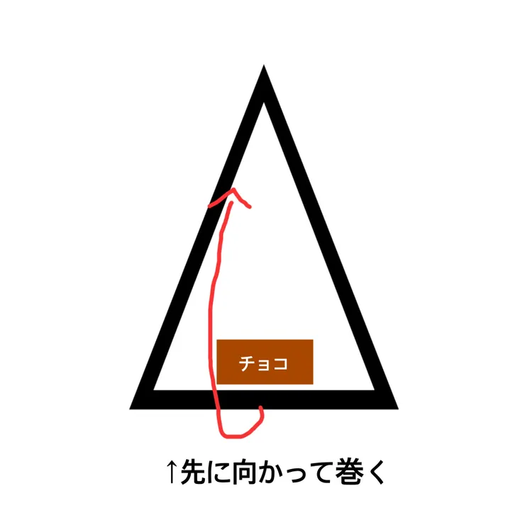 ③図のようにパイ生地を切ったら、左右対称では無いので少し伸ばして形を整え板チョコをカットし図のように置き3角の先に向かってクルクルと巻く。巻終わりはちょっとつまんで置くと膨らんだ時に形が綺麗です。