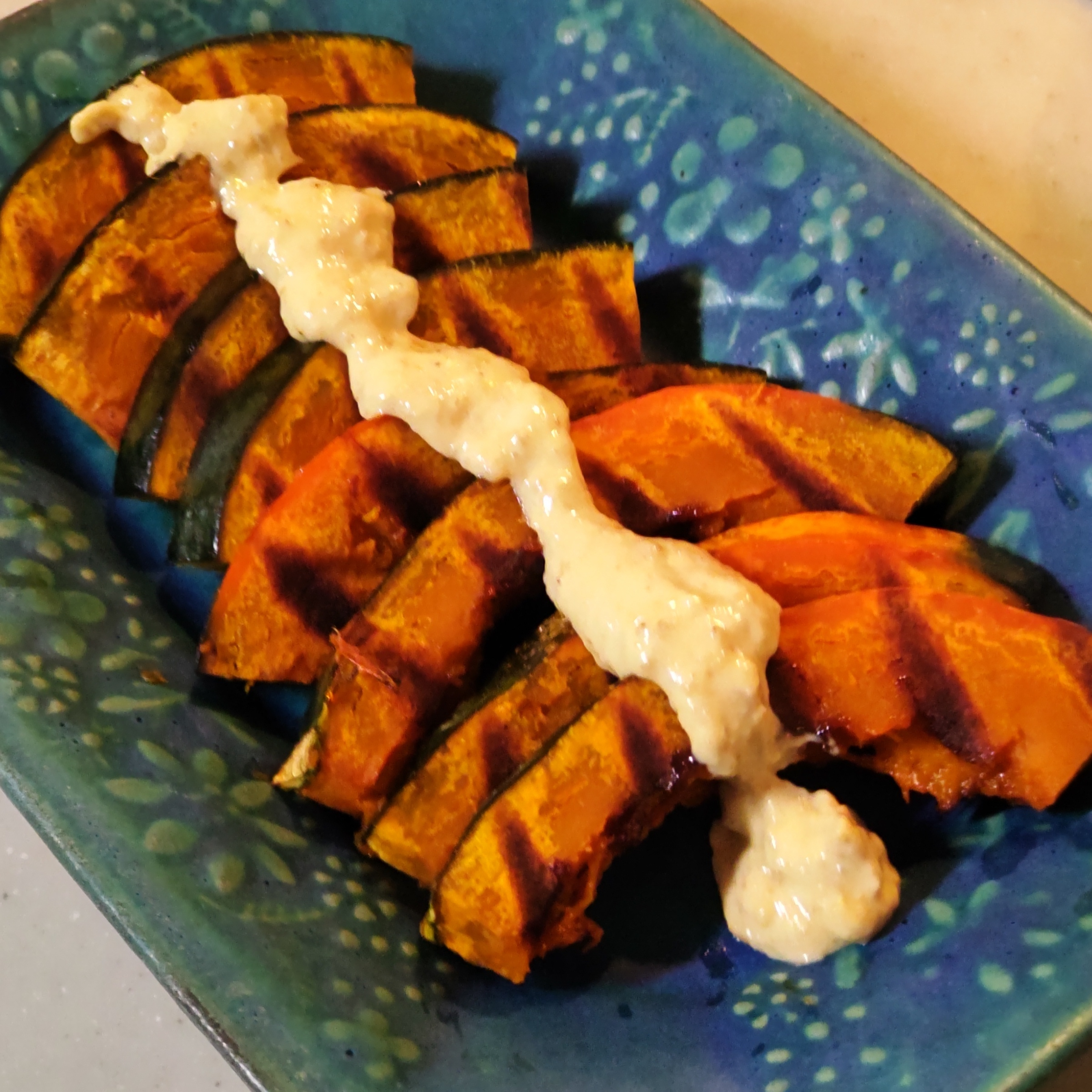以前Rieさんがつくってらっしゃった アプリメニュー「かぼちゃのグリル」ガーリックオイルで焼きますが 上からかけるのではなくて 小皿に入れたガーリックオイルに切ったかぼちゃを浸します そして焼き目つける方向も統一しましょ 焼きあがったら裏返してしばらく余熱でホクホク仕上げ レシピのごまマヨソースが美味なのよさ