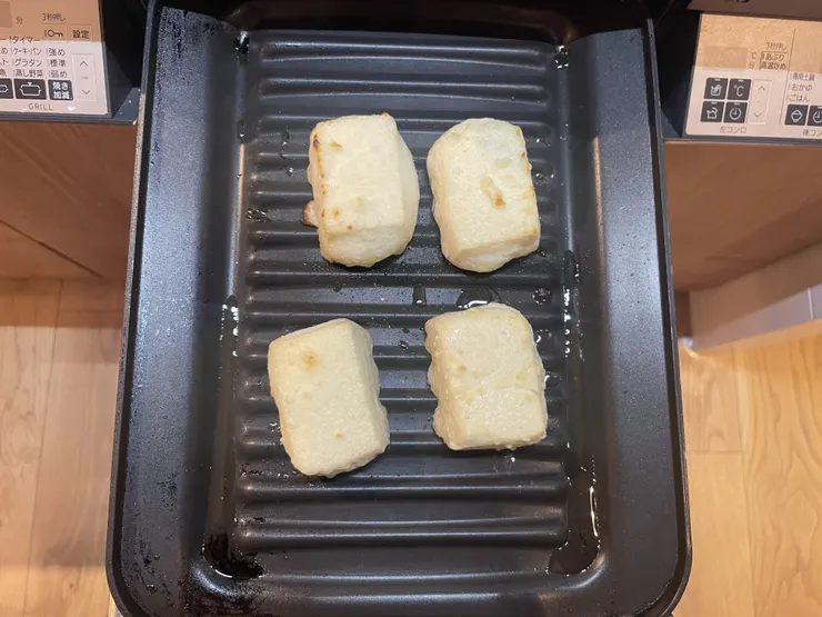水切りした豆腐に片栗粉をまぶしてココットプレート上で油をかけて焼くだけ。すごい手軽に揚げだし豆腐が楽しめます。失敗しないし、手軽で最高。もう一品にちょうどいいです。我が家の定番になりました。