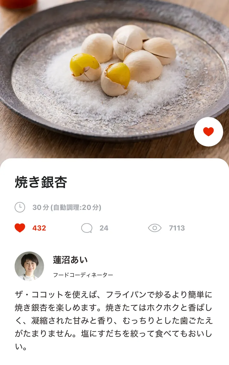 投稿を表示電子レンジ怖い、フライパン面倒。なんとザココットで自動でできるのですね。やります!大量に銀杏あります。