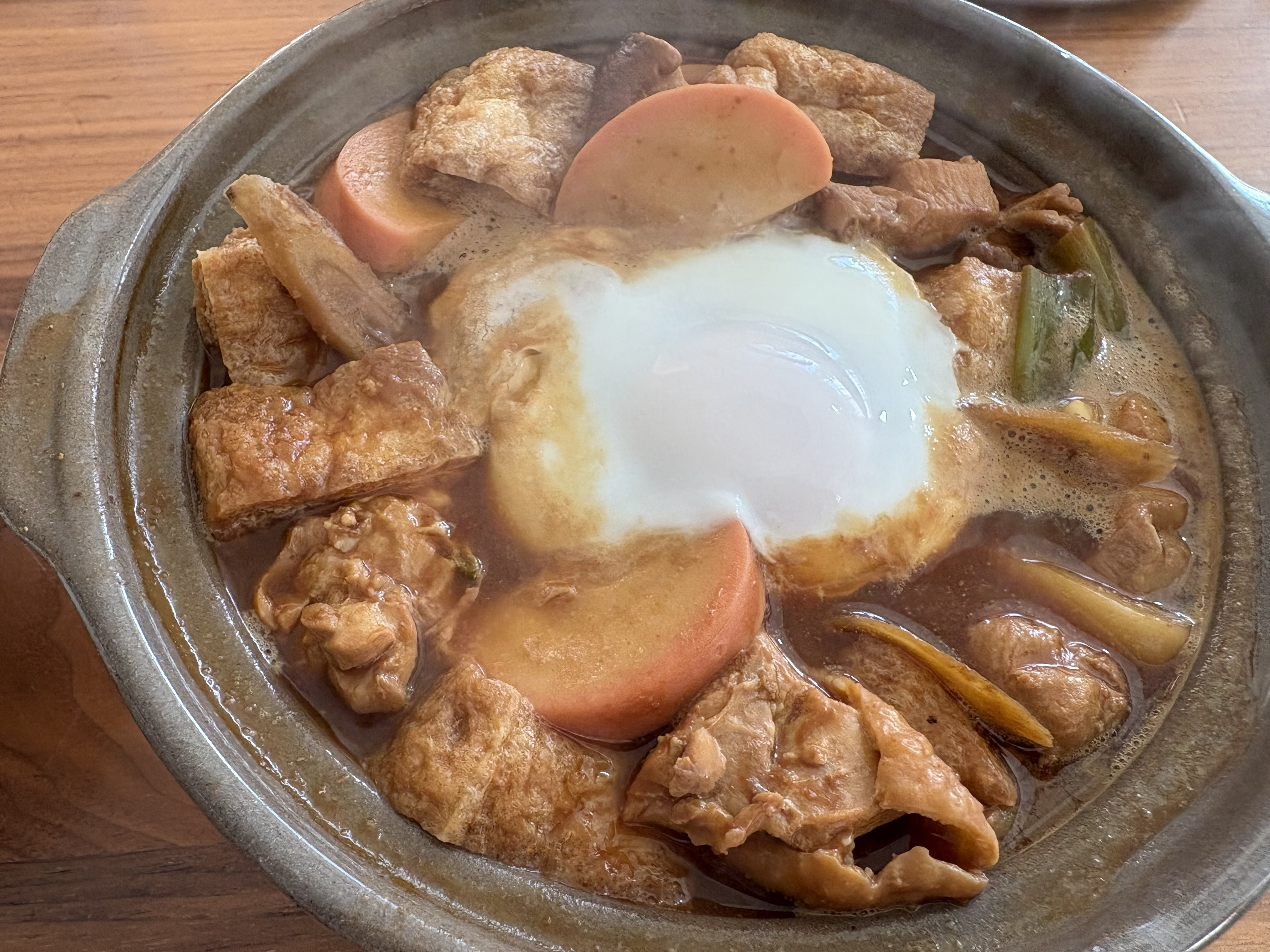 鶏肉、ごぼう、ネギ、椎茸、かまぼこ、油揚げを入れてます。最後に卵を落としてちょっと火を入れて完成です。