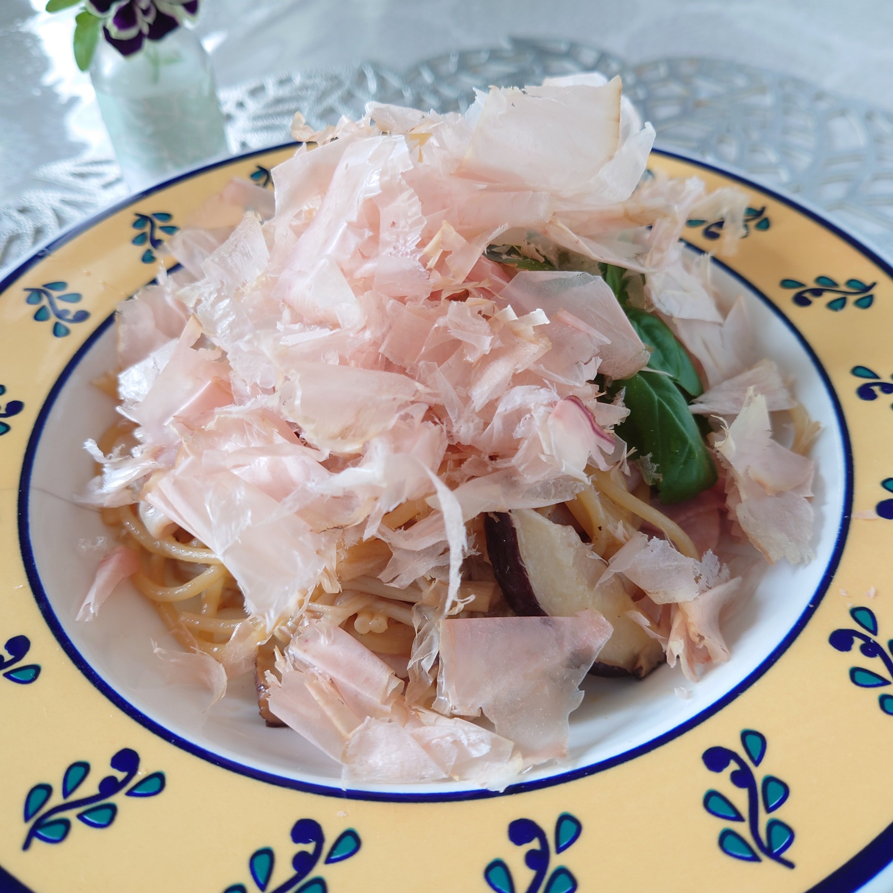 投稿を表示パスタが見えないくらいの鰹節たっぷり!香りもお味も、とってもいいだろうなと思って見ています。
