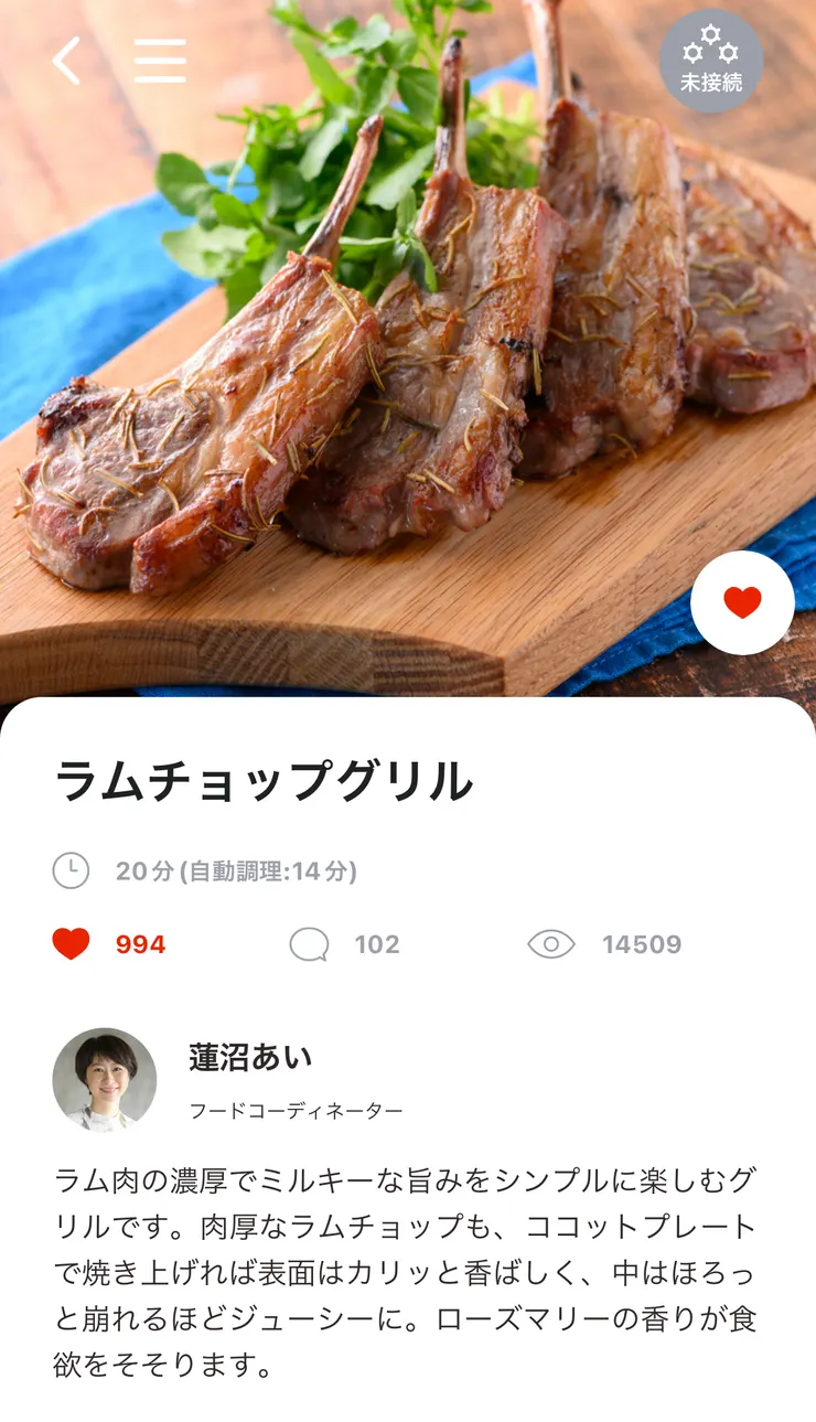 蓋もなんとかのったので、蓋つきで、アプリメニュー「ラムチョップグリル」で自動調理しました。