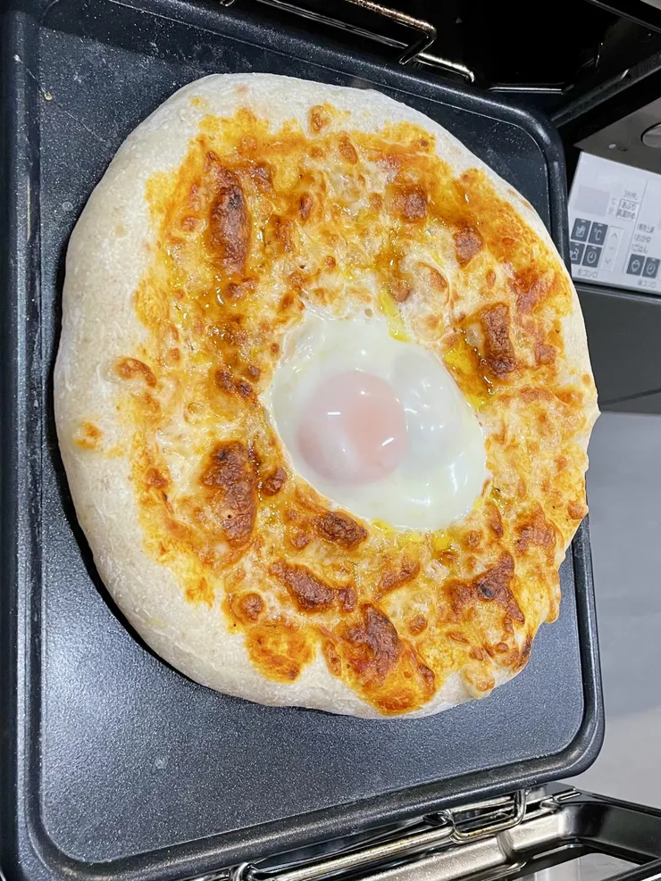 ピザを焼くときは、アプリメニューは使わずに、グリルを予熱してから、トースト・ピザプレートにのせたピザをグリルに入れ、5分焼いたところで取り出したところ、卵の黄身がちょうど半熟に焼き上がって大成功!
