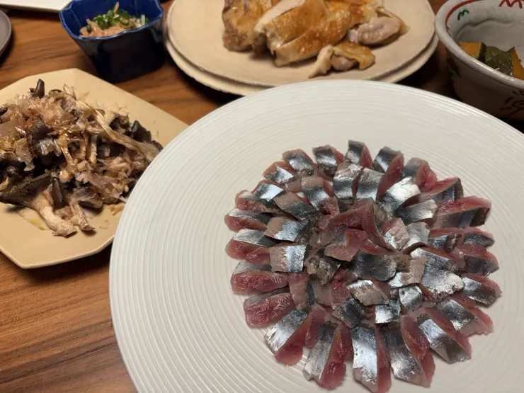 せっかくなので、秋の味覚を…と秋刀魚の刺身と平茸のグリル、見切れてますがかぼちゃの煮付けも食べました。