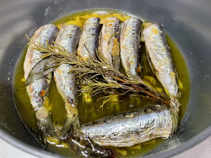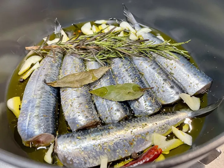 いわしは、クレイジーソルトをかけて、少しおいた後に水分を拭きとってからレジェロに入れて、にんにく、ローズマリー、ローレル、唐辛子、オリーブオイルをかけます。