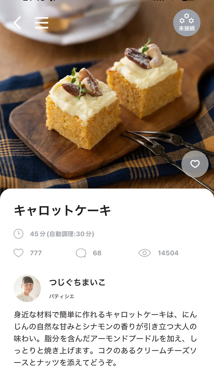 トップ > 暮らしの1枚 > 今日のひとさら > キャロットケーキ 23 2026/03/02 21:22 キャロットケーキ バタバタしている間に2月は逃げ3月。我が家の冷蔵庫は、まだ人参がいっぱいです。 そうだ、キャロットケーキ!と、ザココットで焼いてみました。材料を12㎝のデコ型におさまるように調整しましたが、やはり上が焦げました。フロスティングしてしまえばわかりません。 いいね 共有する 共有する X facebook LINE リンクをコピー コメントする 5 件の返信 (新着順) ミュートしたユーザーの投稿です。 投稿を表示 ミック 2026/03/04 07:40 美味しそうなキャロットケーキですね 盛り付けもキレイ,フロスティングというのですね いいね 返信する ミュートしたユーザーの投稿です。 投稿を表示 23 2026/03/04 12:06 ミック ありがとうございます。本当は小さい人参🥕のグラッセを作って人参らしさを出したかったのですが、なかなか作れません。 いいね 返信する ミュートしたユーザーの投稿です。 投稿を表示 オリエンタルリリー 2026/03/03 16:12 にんじんケーキ、いいですね。いまはにんじんが甘いので、わたくしはにんじんポタージュ作りました いいね 返信する ミュートしたユーザーの投稿です。 投稿を表示 23 2026/03/03 20:38 オリエンタルリリー ありがとうございます。人参ポタージュ🥕も美味しいですよね。毎日いろいろ人参ですが、美味しいからまだまだ食べられます。 いいね 返信する ミュートしたユーザーの投稿です。 投稿を表示 かが@リンナイコミュニティマネージャー 2026/03/03 08:24 フロスティングって言うんですね👀 見た目がすごいおいしそうすぎます🤤 いいね 返信する ミュートしたユーザーの投稿です。 投稿を表示 23 2026/03/03 11:54 かが@リンナイコミュニティマネージャー ありがとうございます。自動調理のおかげで手軽にふっくら焼けて、フロスティングも美味しくて、実は今2台目を焼いています。はまりました。 いいね 返信する ミュートしたユーザーの投稿です。 投稿を表示 Delico 2026/03/03 05:12 フロスティングという言葉、初めて聞きました👀勉強になります! いいね 返信する ミュートしたユーザーの投稿です。 投稿を表示 23 2026/03/03 07:52 Delico ありがとうございます。クリームチーズのフロスティング、コクと爽やかさがあって、キャロットケーキに合います。 いいね 返信する ミュートしたユーザーの投稿です。 投稿を表示 だがね 2026/03/02 21:40 素材のおいしさがポイントですね。フロスティングのアイデアがすてき! いいね 返信する ミュートしたユーザーの投稿です。 投稿を表示 23 2026/03/02 22:43 だがね ありがとうございます。フロスティング美味しいですが、かなりカロリーアップしました。 いいね 返信する
