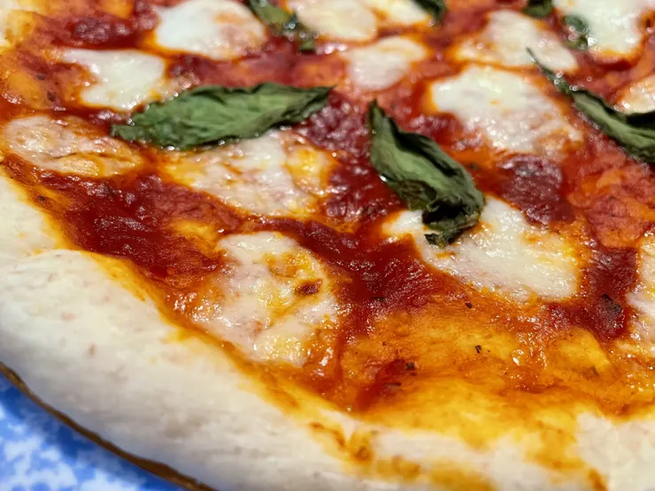 早速、ホームベーカリーでピザ生地を作り、モッツァレラチーズをのせてマルゲリータを焼いてみました。生地は全粒粉も入れています。