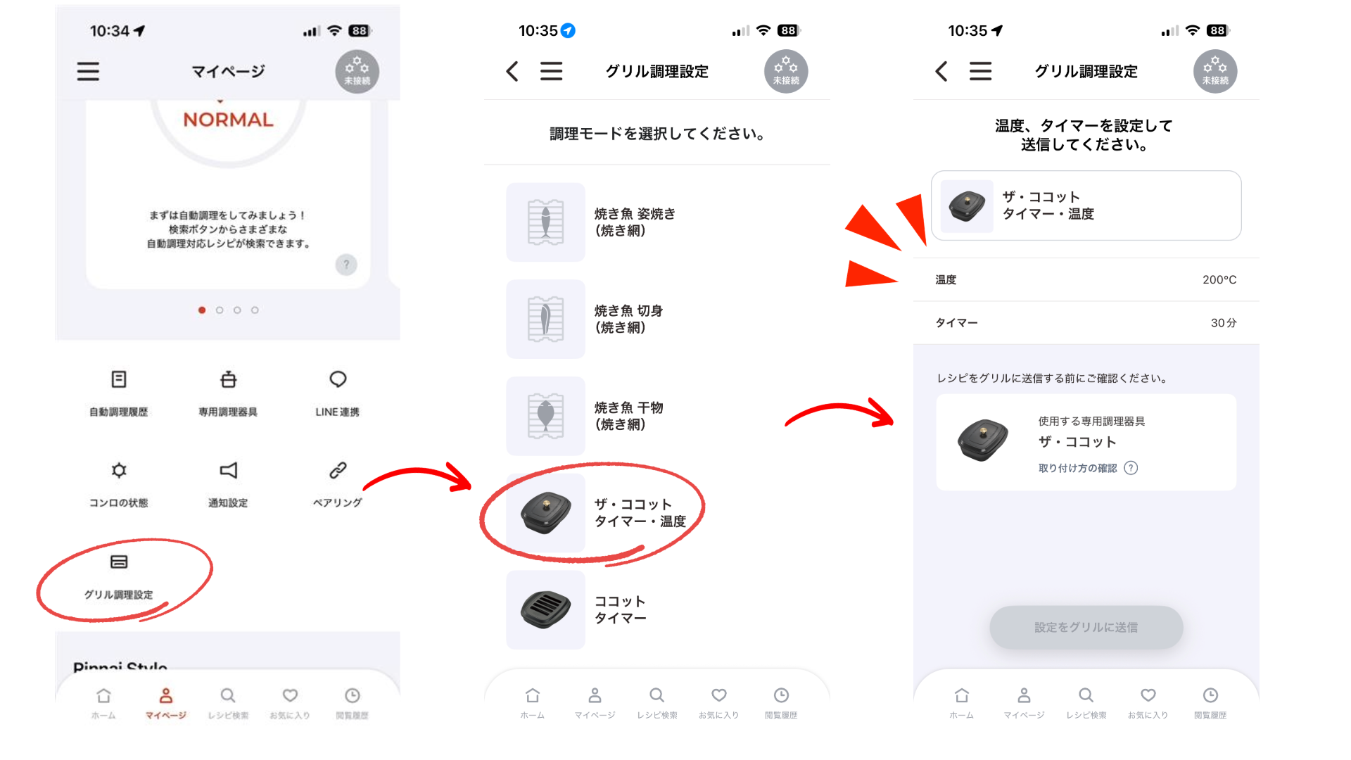 この操作ができるコンロは限定されるのですが、マイページのグリル調理設定からザ・ココットを使った調理のタイマーと温度設定ができます!