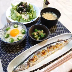 晩ごはん 秋刀魚の塩焼きをグリルで焼きました。グリルが古いので、片面焼きなので、毎回秋刀魚が折れそうになります💦