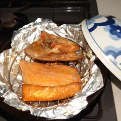 アトランティックサーモンの燻製 アトランティックサーモンのかまとハラスの燻製を作りました♪待ち切れな組手、塩漬けは1日だけで燻製にしたので、優しい塩味に仕上がりました😋