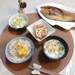 秋満載ご飯 栗ごはんを作りました😋ほっけが大きすぎてグリルに1枚しか入りませんでした😅豆腐とねぎのお味噌汁、蓮根とソーセージの炒めもの、キャベツときゅうりの浅漬けです。