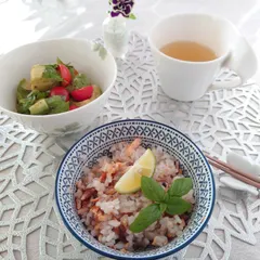 幸せお昼ご飯 自家製のさしす梅干しの梅酢を三十雑穀ご飯にあえ、燻製したアトランティックサーモンを入れ混ぜご飯にして、すだちとベランダのバジルを添えました😋 奥は、アボカド、ミニトマト、ベランダのバジルのサラダです😋