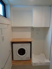乾太くん 新築時に乾太くんを設置しました。当時の乾太くんのカタログ表紙を真似して洗濯機の横に設定。背の低い私でも子供でも取り出すことができます。乾太くんの上に設置した台は、当初はお風呂に入る時の着替えを置いたりアイロン掛けに使用する予定でしたが、いまでは乾いた洗濯物が積まれています…あっと言う間に乾くので、乾