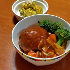 美味しそうな煮込みハンバーグとかぼちゃのサラダですね ふっくら柔らかそうなハンバーグとっても美味しそうですね