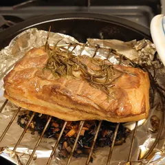 自家製ベーコンローズマリー風味 いつものベーコンをローズマリー風味にしてみました😋今まで、一緒に塩漬けしても燻製の時に外していたので、一緒に燻製したらどうなるのか?試してみました((o(´∀`)o))ワクワク しっかりローズマリーの風味が加わり美味しく出来ました😋