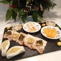 ベーコンとからすみを作ったので、おつまみプレートを作りました😋 かまぼこに数の子を詰めた物、自家製ベーコンにのり天をトッピング、自家製のからすみ、干し大根の柚子巻、花蓮根、塩ぎんなんを盛り付けました😋